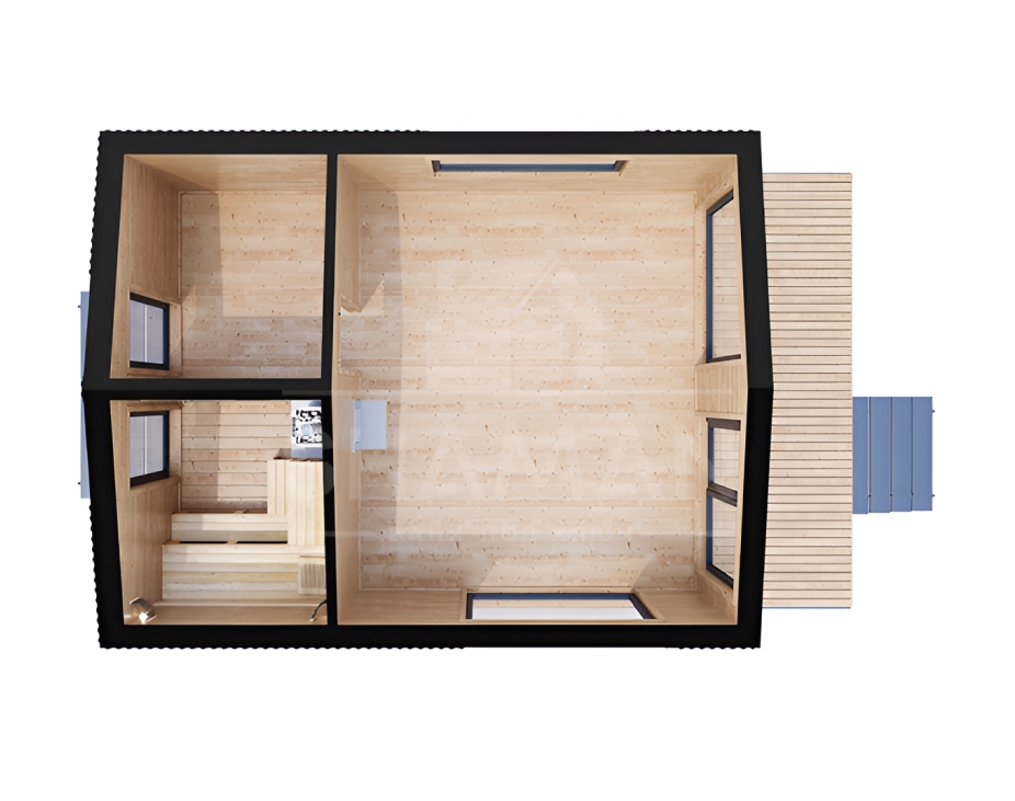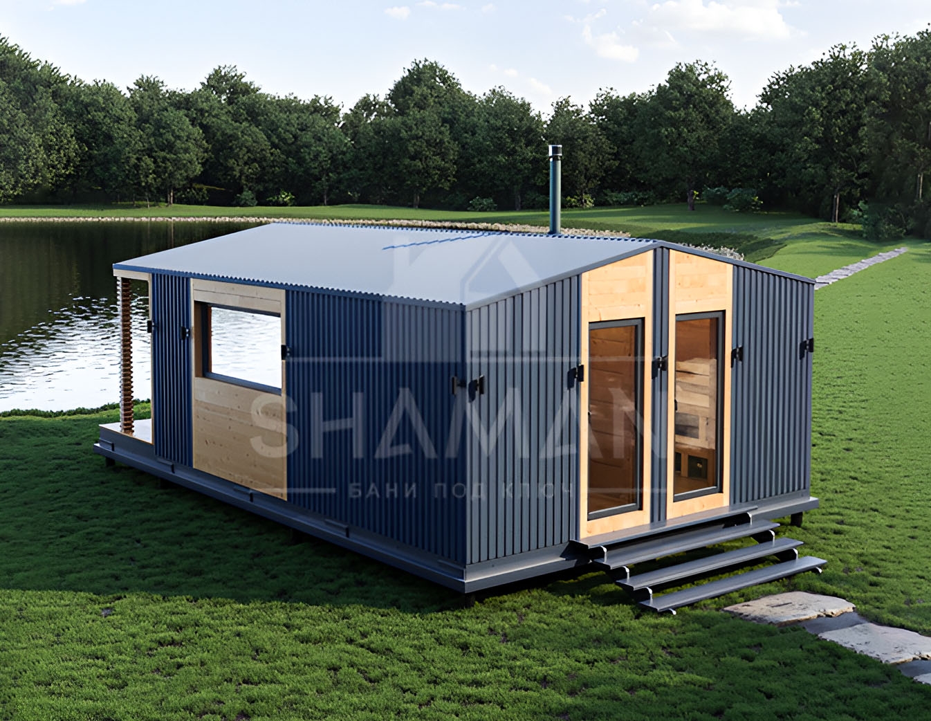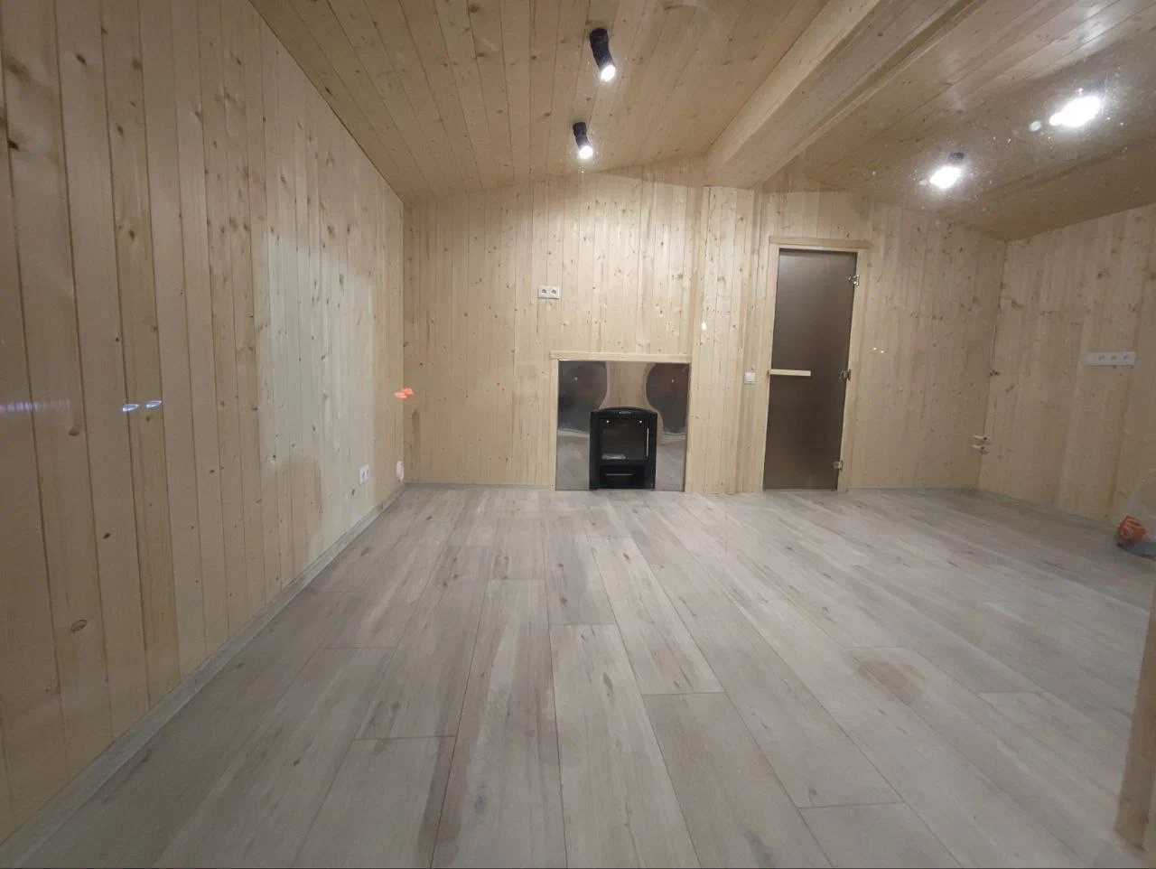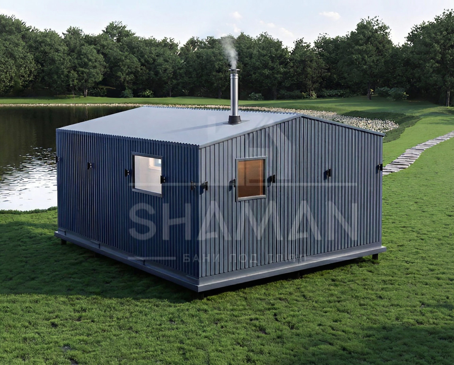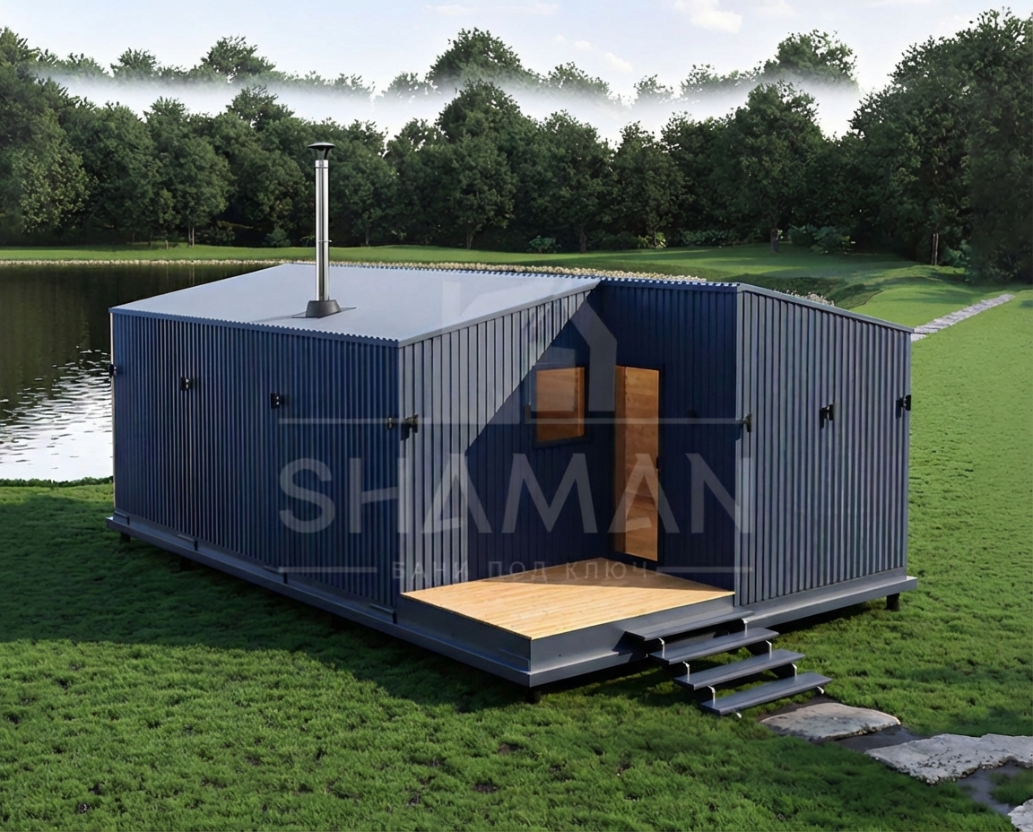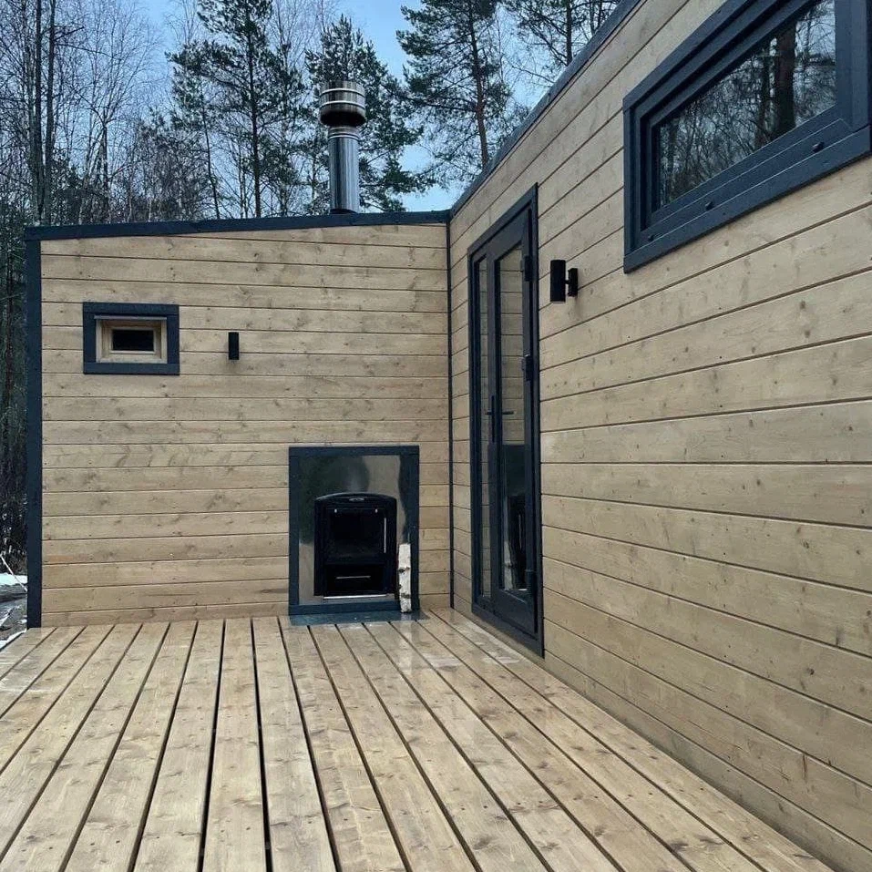 проливной пол из лиственницы, торшерные светильники, стеклянная дверь, печь, бак для нагрева горячей воды на 50л, дымоход – сэндвич труба, камни для печи.