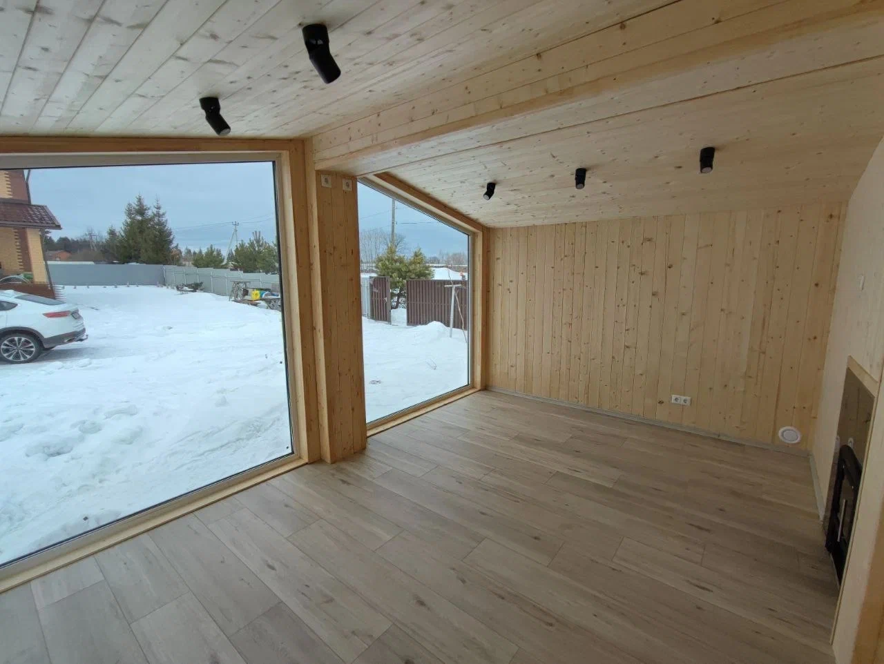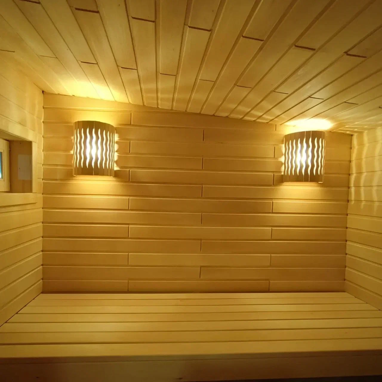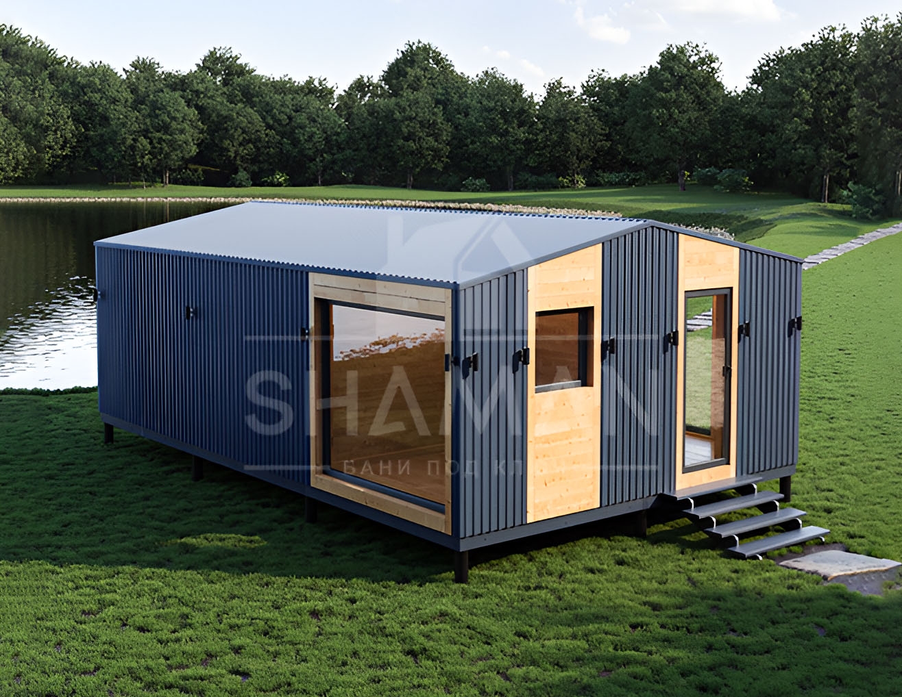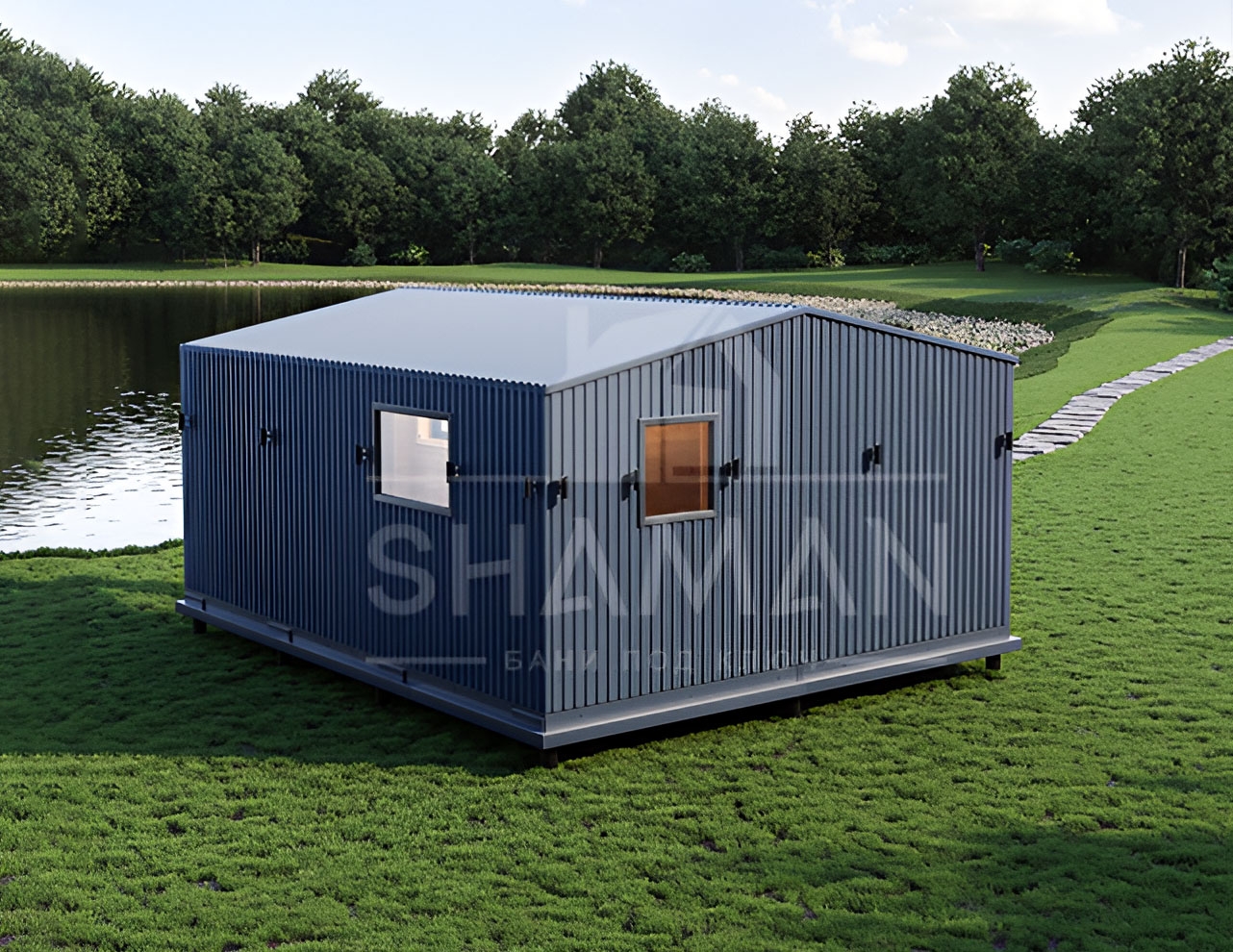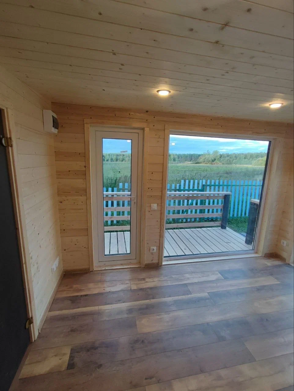 проливной пол из лиственницы, торшерные светильники, стеклянная дверь, печь, бак для нагрева горячей воды на 50л, дымоход – сэндвич труба, камни для печи.
