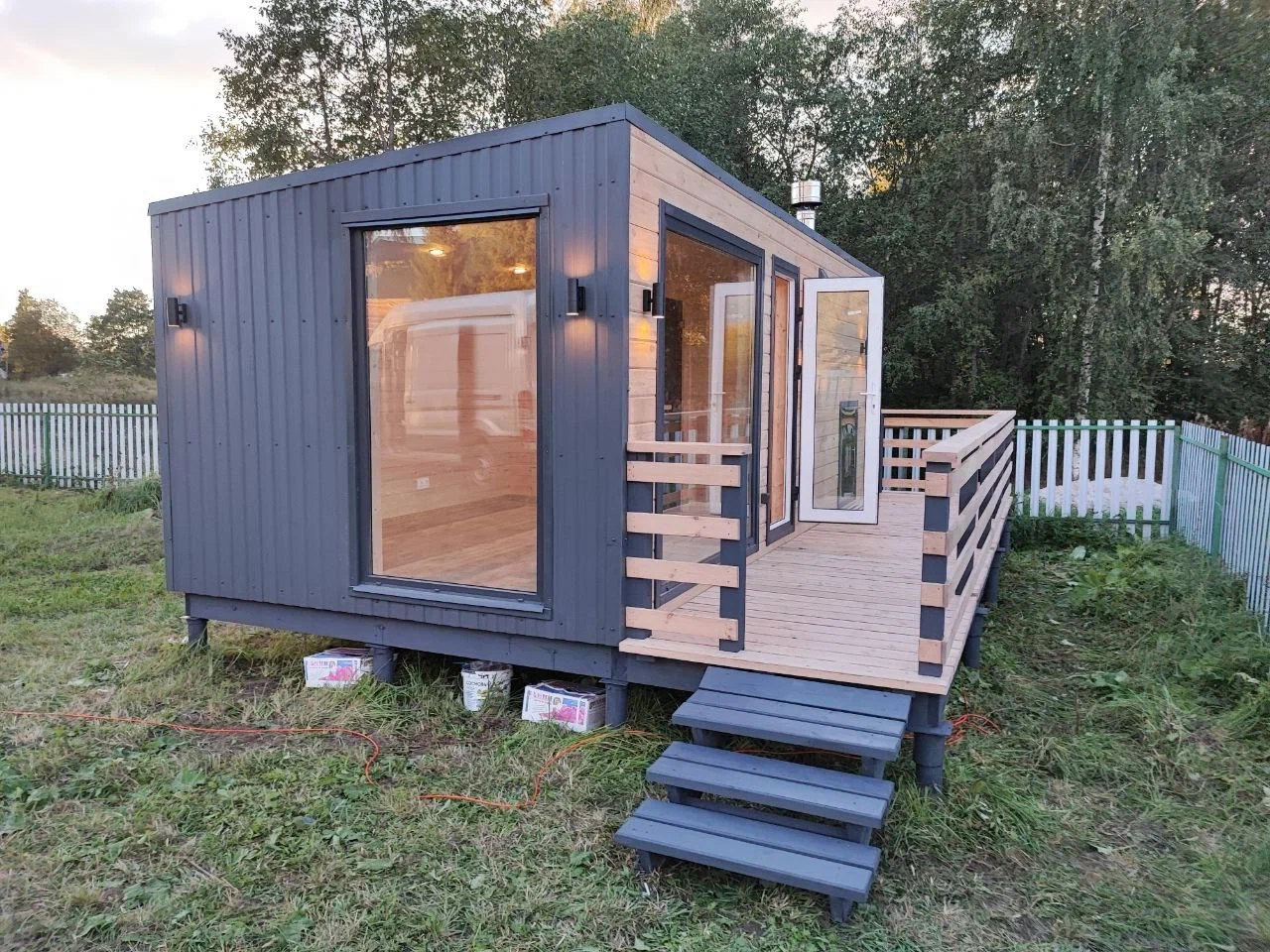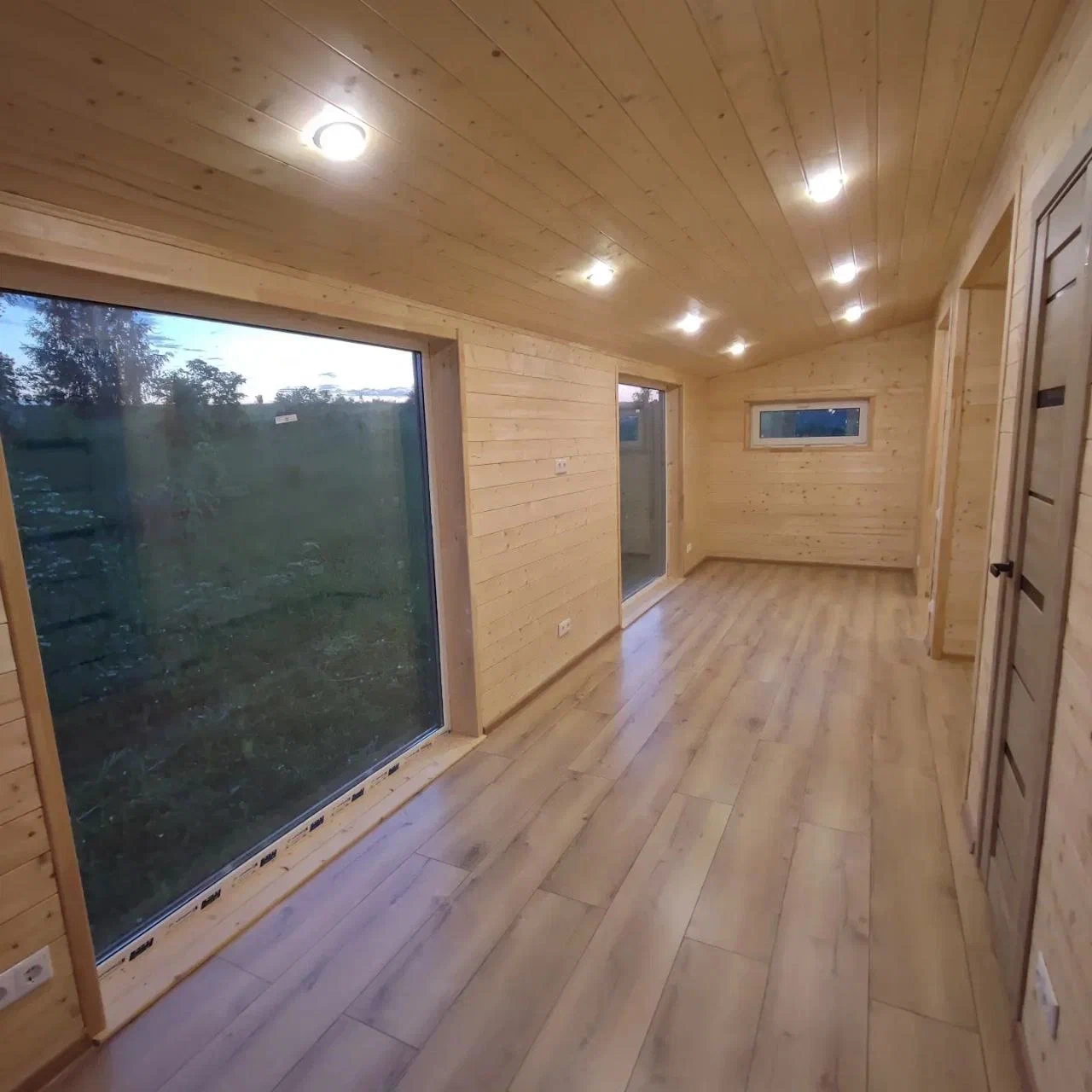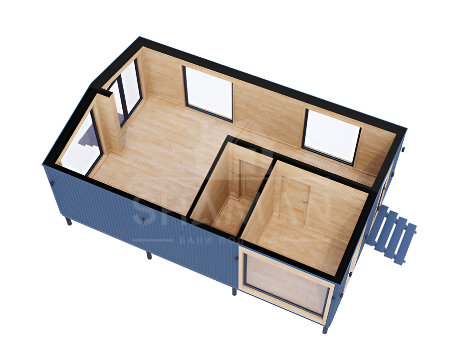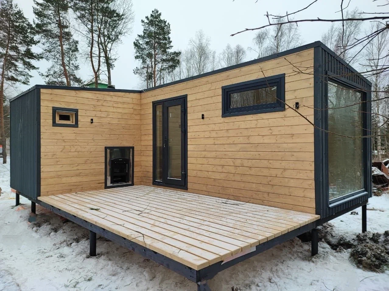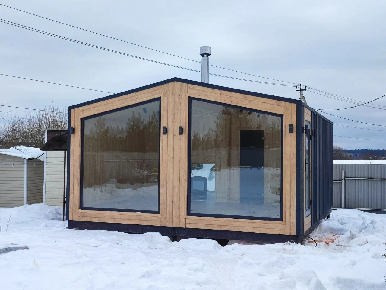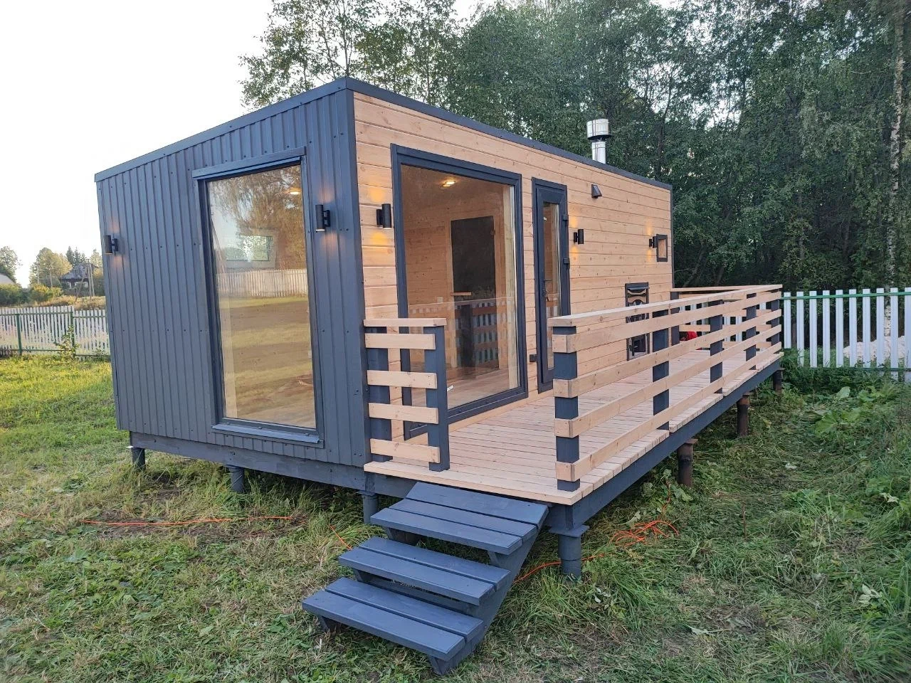 проливной пол из лиственницы, торшерные светильники, стеклянная дверь, печь, бак для нагрева горячей воды на 50л, дымоход – сэндвич труба, камни для печи.
