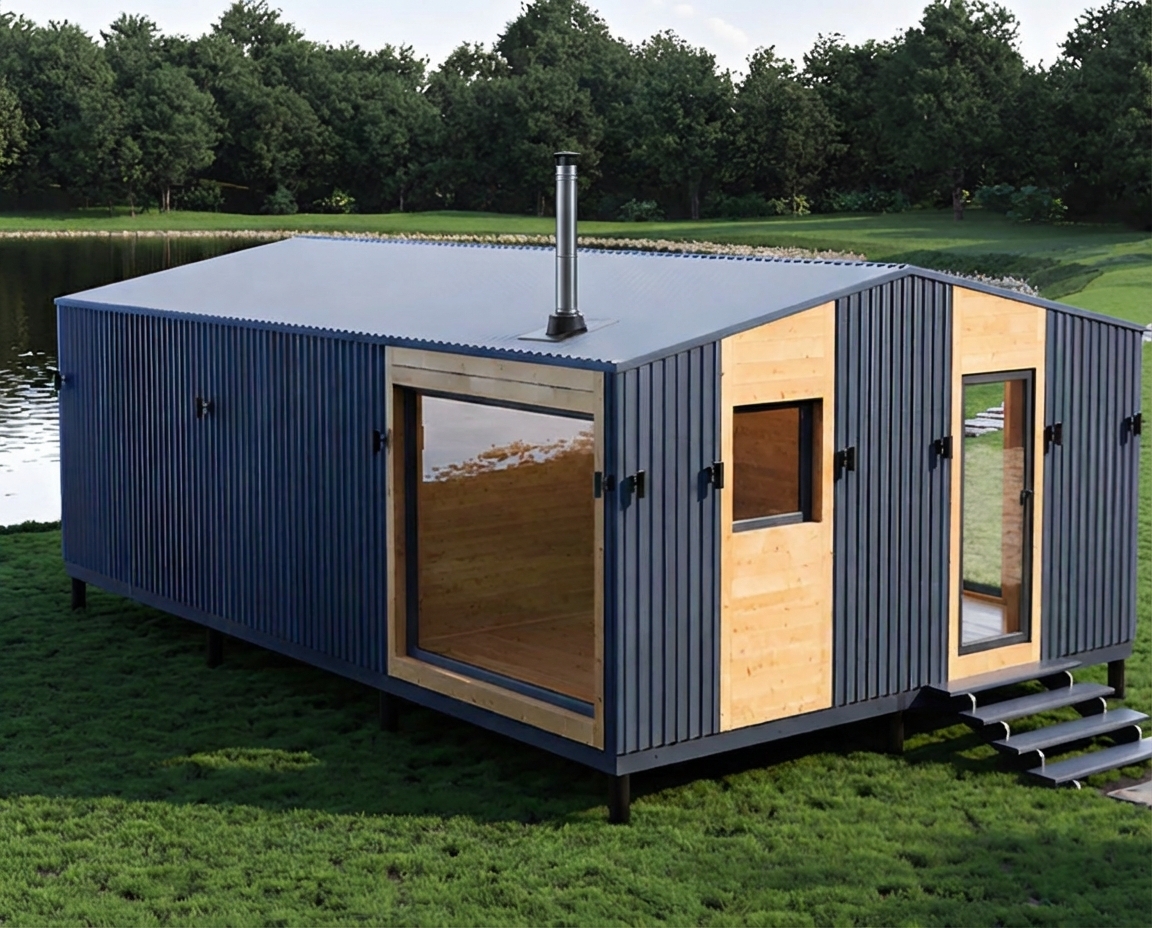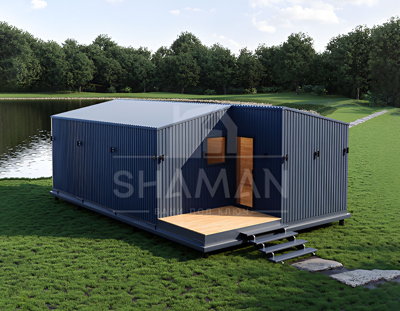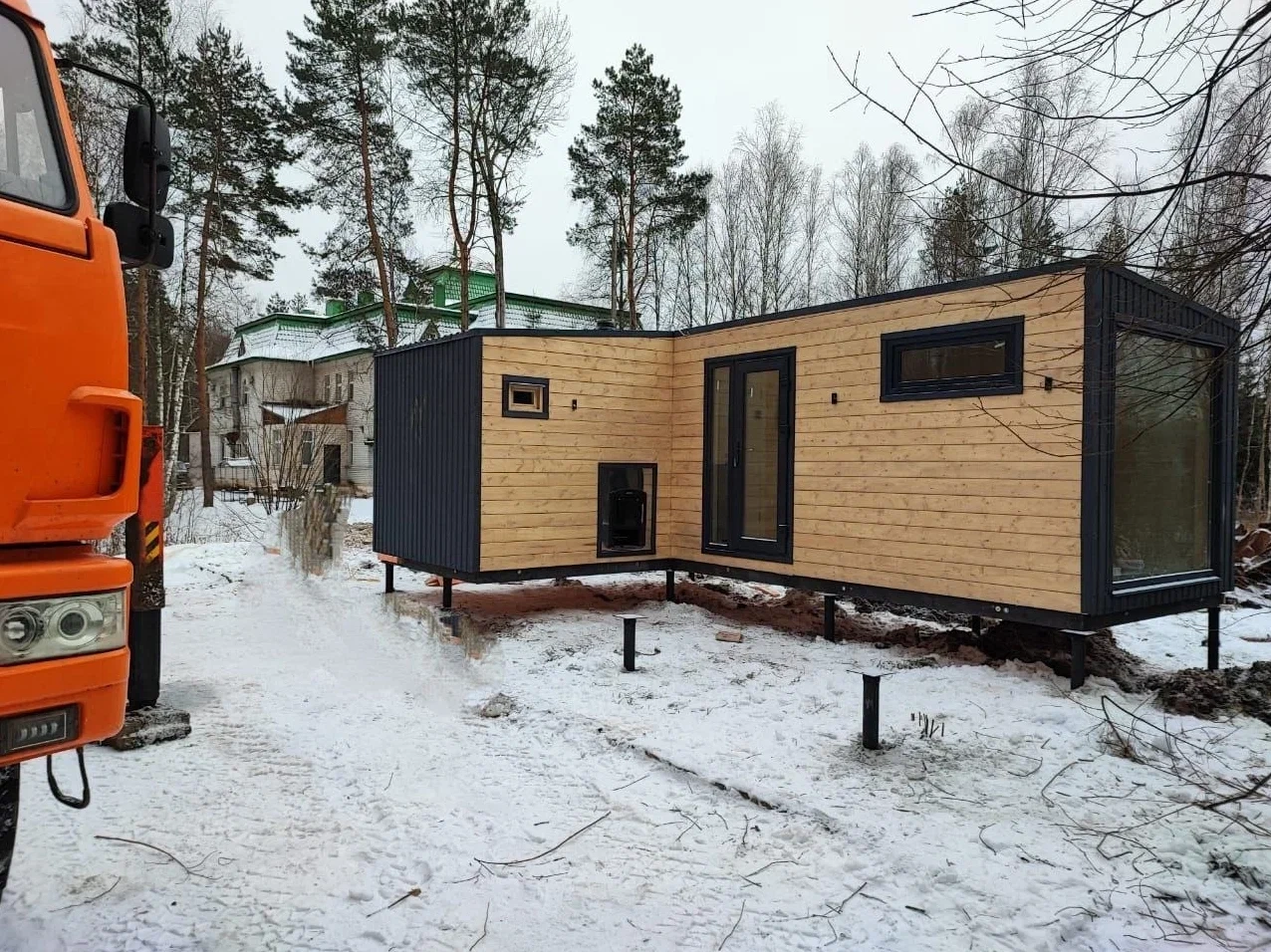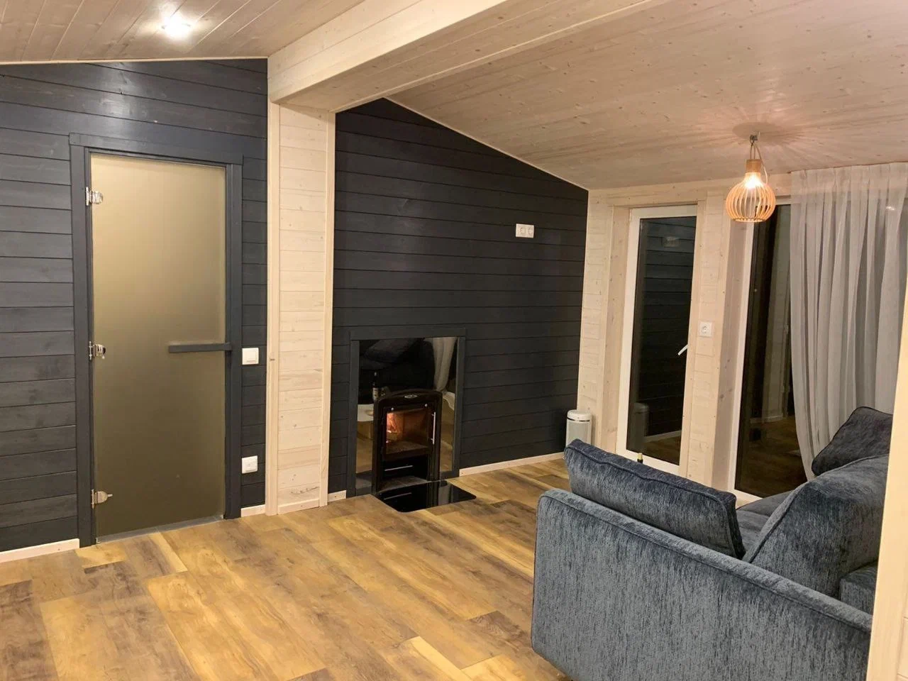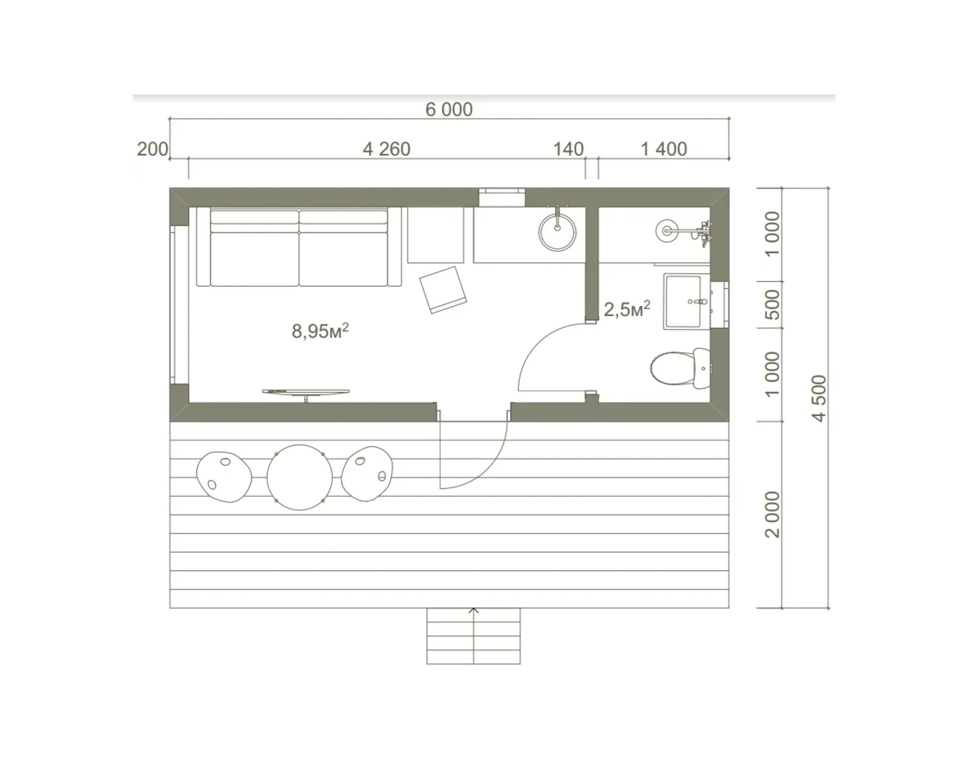проливной пол из лиственницы, торшерные светильники, стеклянная дверь, печь, бак для нагрева горячей воды на 50л, дымоход – сэндвич труба, камни для печи.