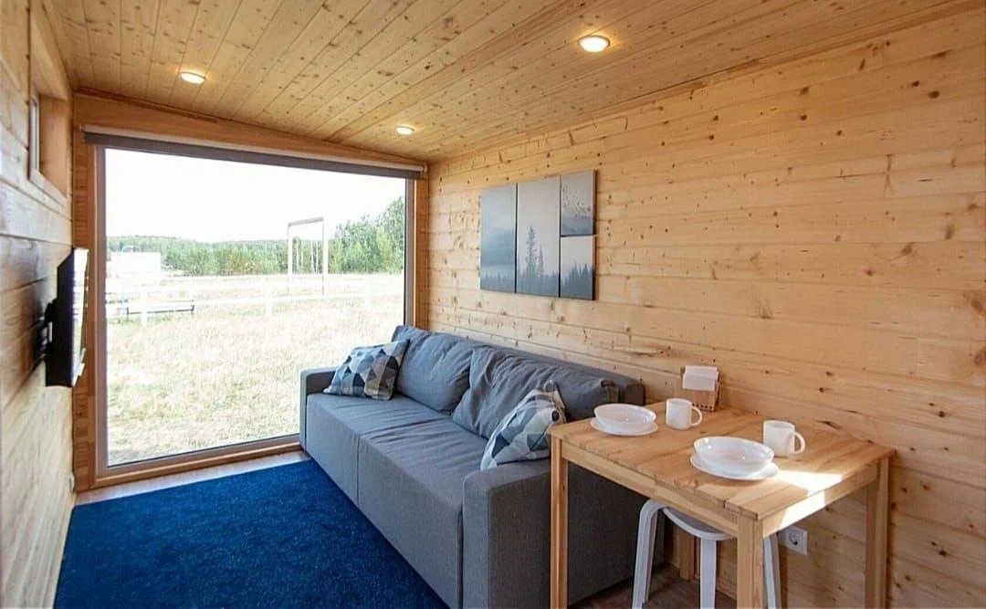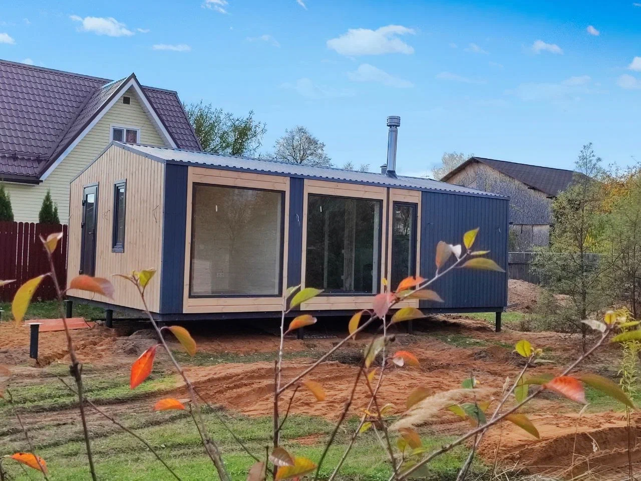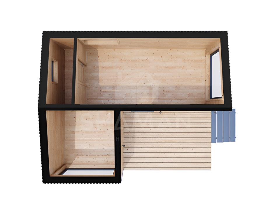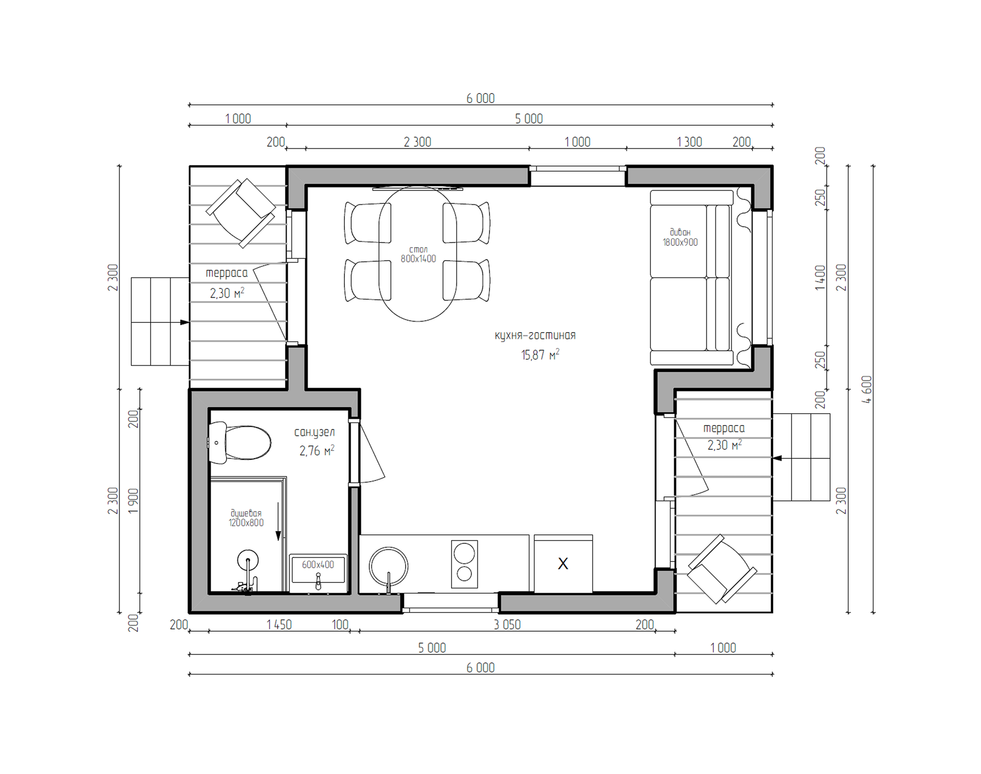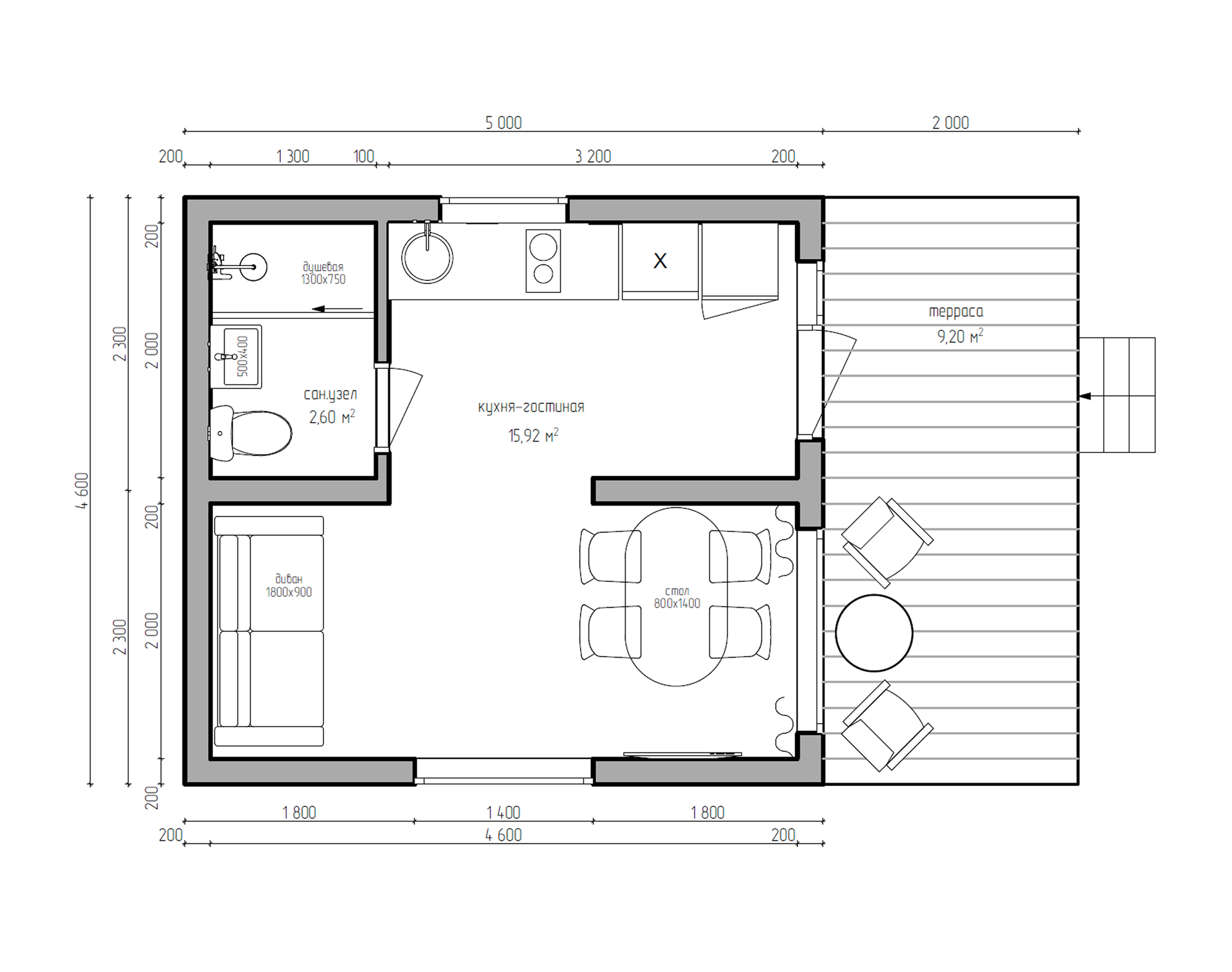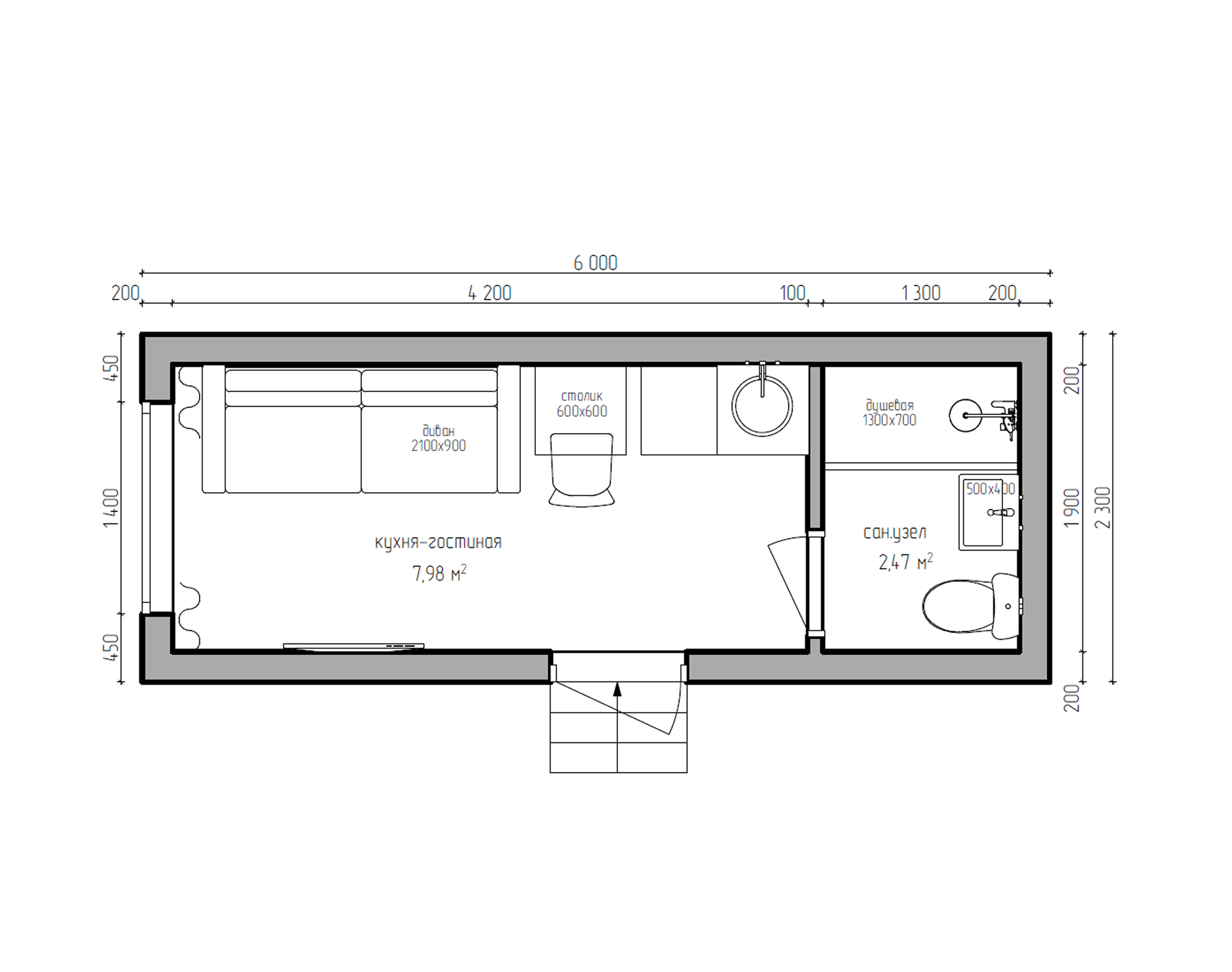 проливной пол из лиственницы, торшерные светильники, стеклянная дверь, печь, бак для нагрева горячей воды на 50л, дымоход – сэндвич труба, камни для печи.