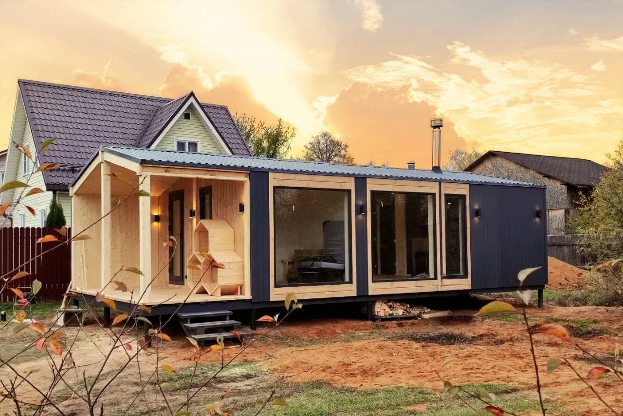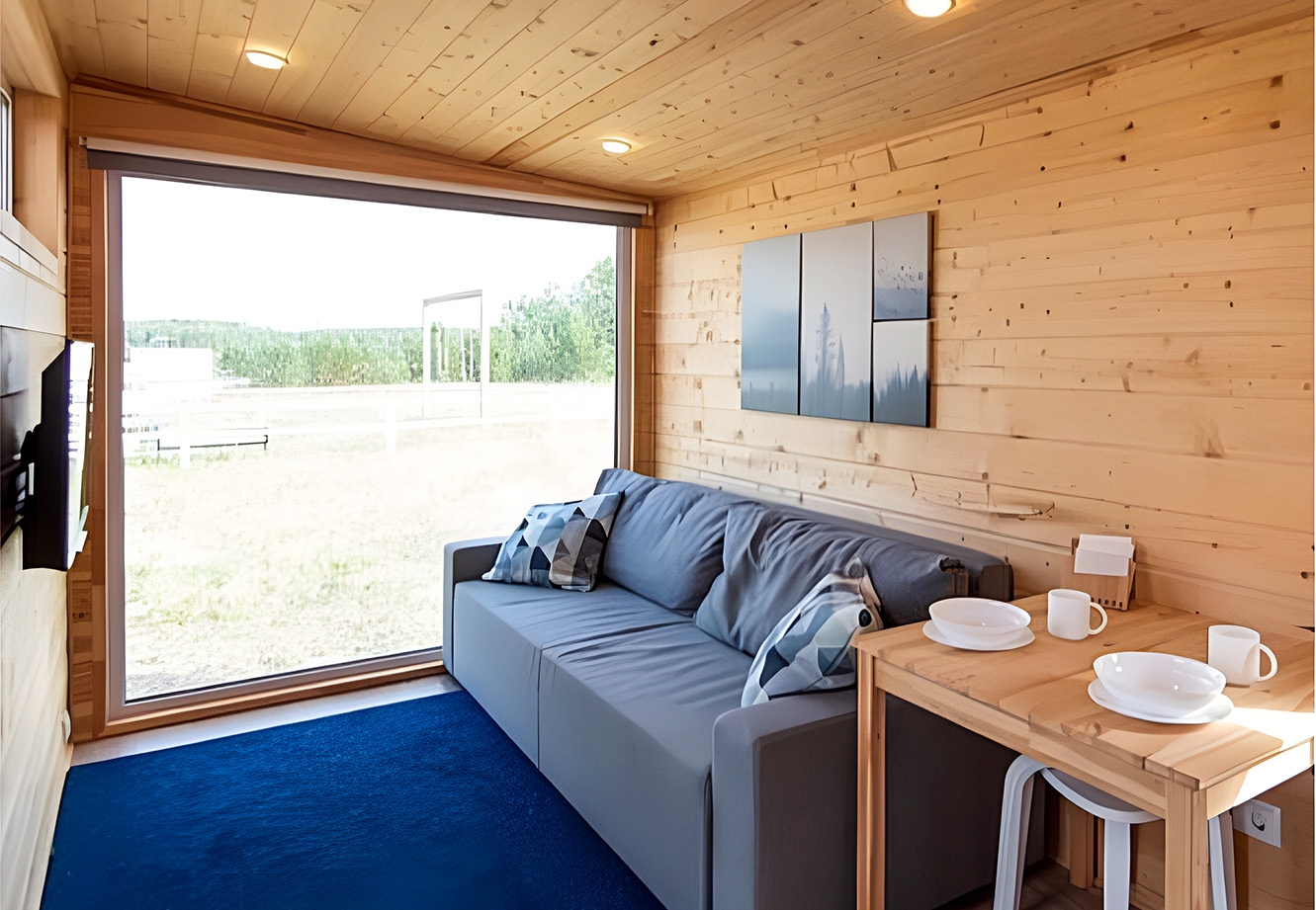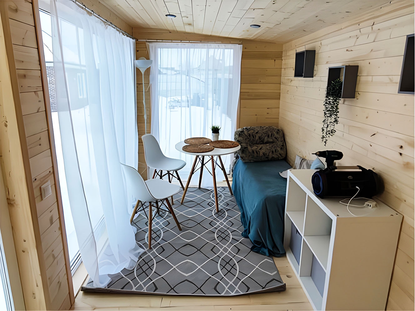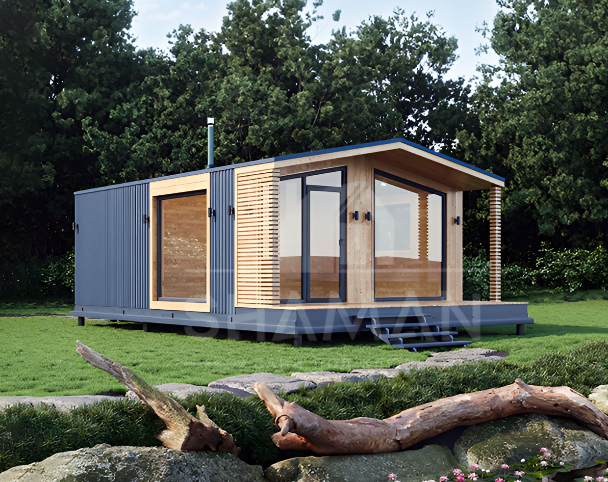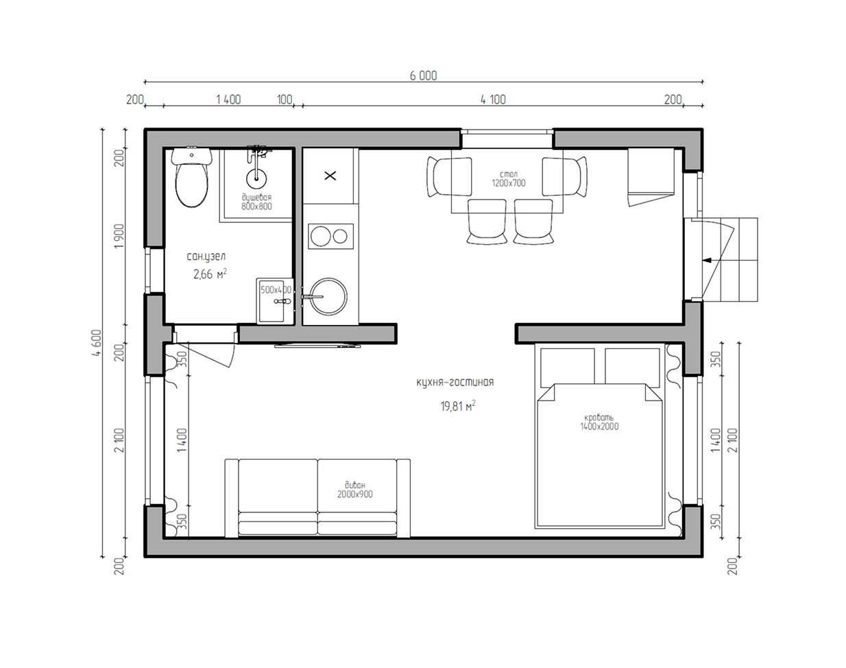 проливной пол из лиственницы, торшерные светильники, стеклянная дверь, печь, бак для нагрева горячей воды на 50л, дымоход – сэндвич труба, камни для печи.